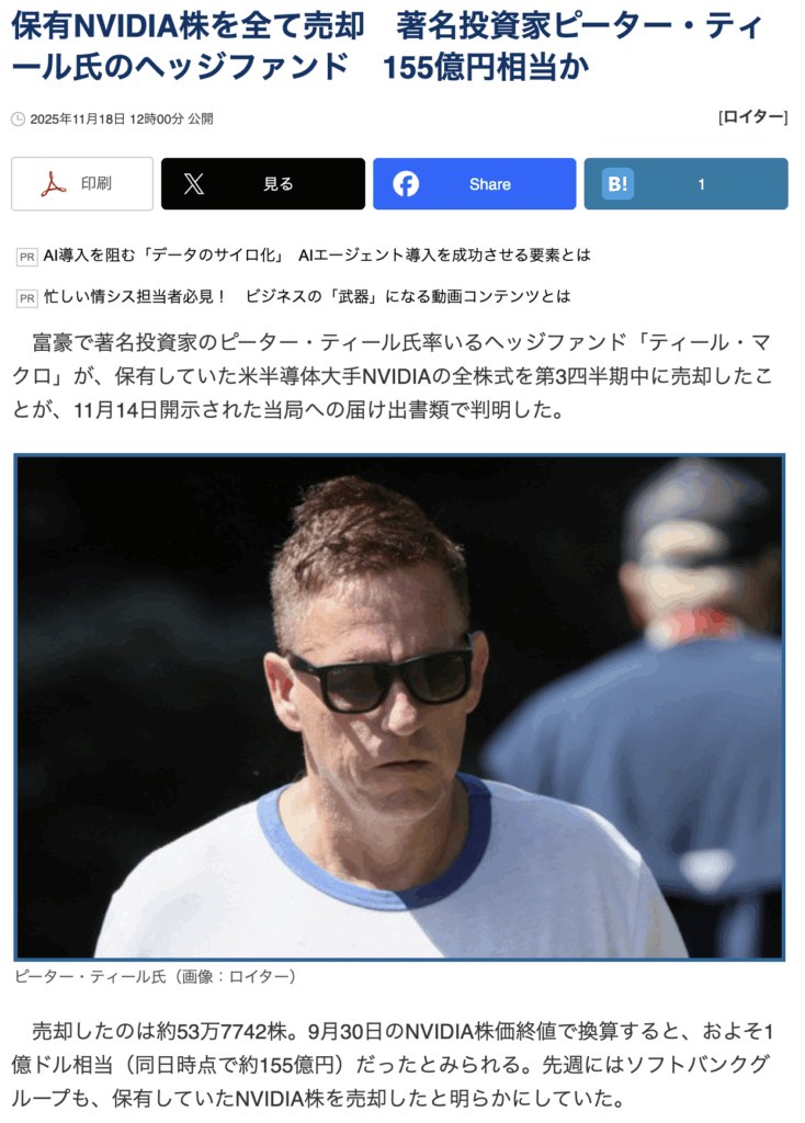 高市発言が〜、中国が〜、トランプが〜、、、なんてものは全てこじつけに過ぎず、NVIDIAがどんな決算内容を発表するのか?それは事前に漏れてしまっていたから孫正義やピーターティールは動いたのか?、、、そんな疑心暗鬼がとりあえずスッキリするのが11月19日決算なのです。