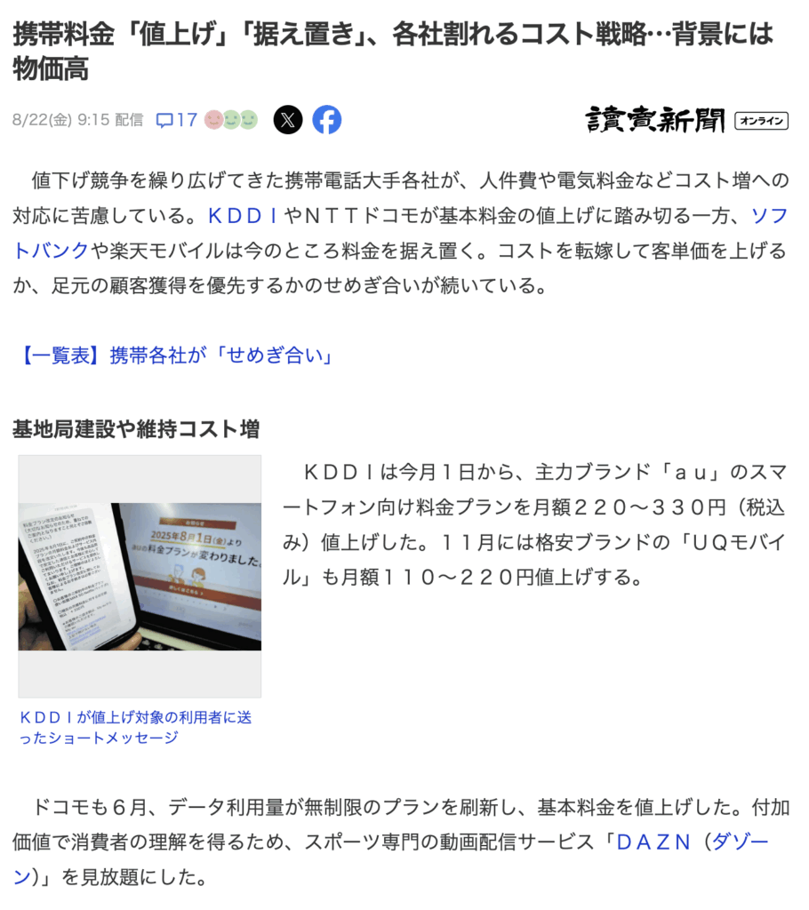 もちろん楽天だって基地局の維持とかでコストは上がっているのですが、楽天はスマホをフックにして楽天経済圏でユーザーを囲い込む、、、という商法を目指していますので、他スマホキャリアより価格耐性があると思われます。